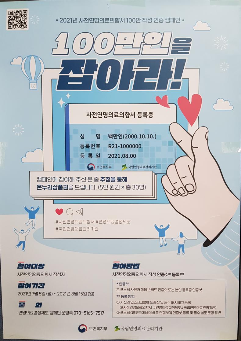 제목 2021년 사전연명의료의향서 100만 작성 인증 캠페인